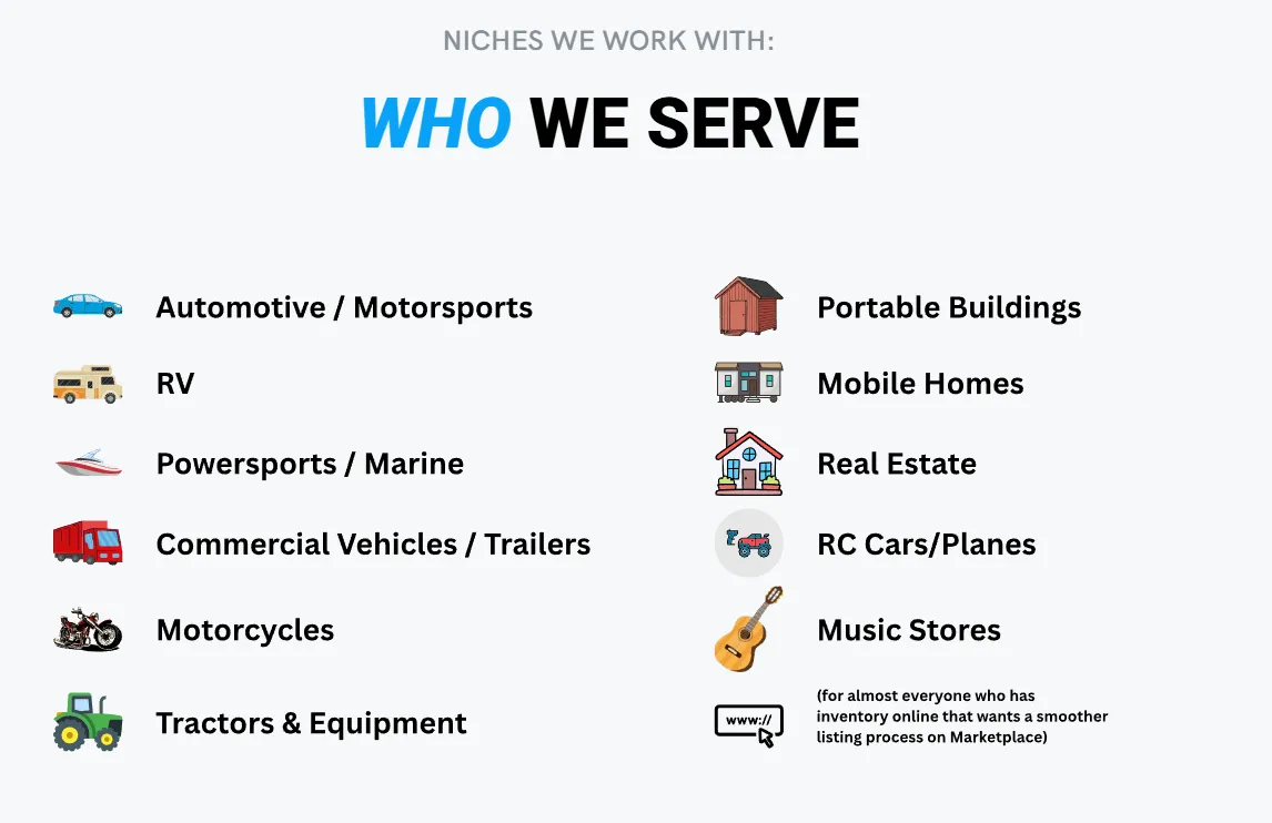 Shiftly helps you skip the posting grind, the manual managing, the mailing, and the endless chasing for leads—so you stop wasting time and stressing over your marketing. After you connect your RV inventory, you can get started quickly and keep listings fresh as units arrive or sell. (Per your plan: insert your full “All Niches We Serve” list right after this section.)